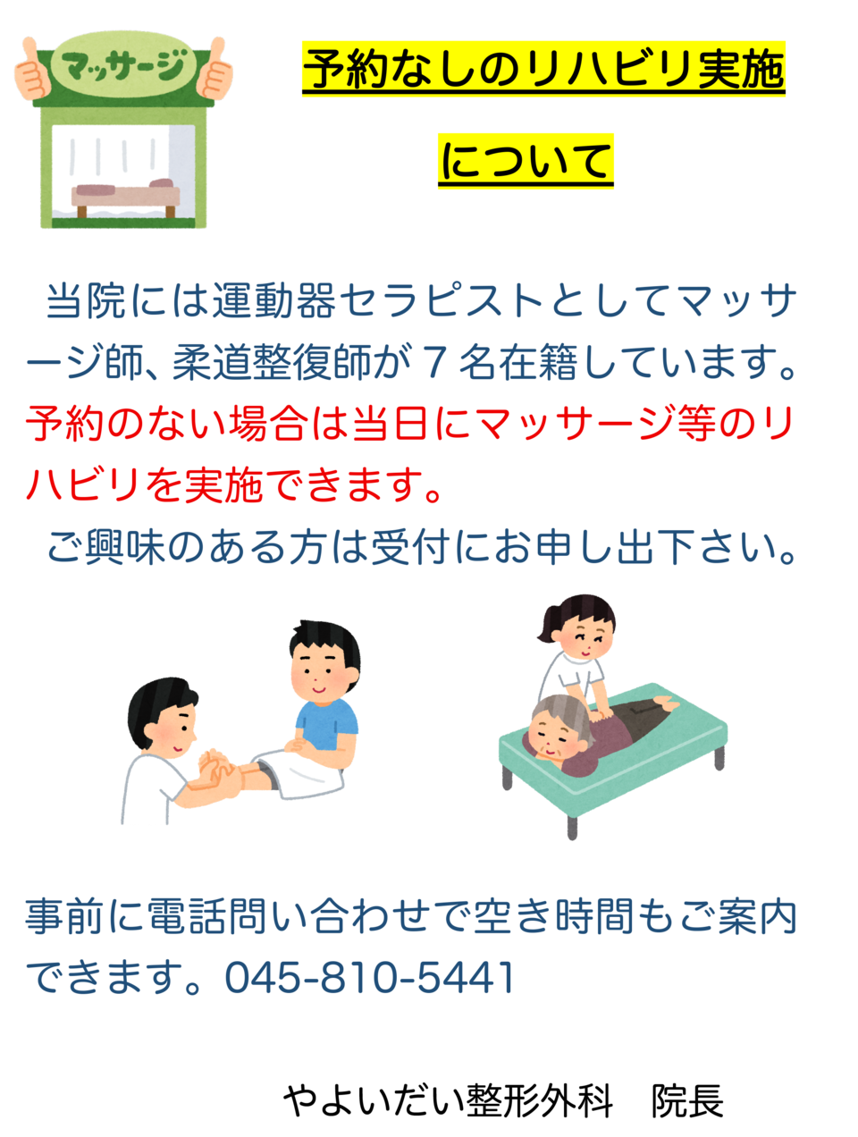 運動器セラピスト(柔道整復師・マッサージ師)の増加に伴い、事前の予約のない方でも施術者の予約枠が空いている場合はリハビリを受けることが出来ます。